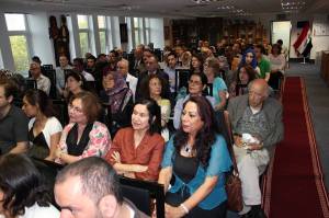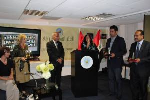 There was a large and responsive audience. Because poetry is still very centra l to Iraqi culture, people love and respond to it far more vocally than in the UK where it has become marginalised. When we read some lines particularly well, or the sentiment was particularly liked there would be spontaneous applause and sounds of appreciation from the audience who also kept eye contact with us throughout the one and a half hour reading, smiling and nodding to show their enjoyment and understanding. This warmth and energy fuelled our reading considerably and it became very much a two-way dialogue.