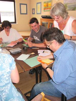 Fran designed and laid out the material for them and provided brightly coloured covers and we spent a fun and informative two-hour session making books with the group.